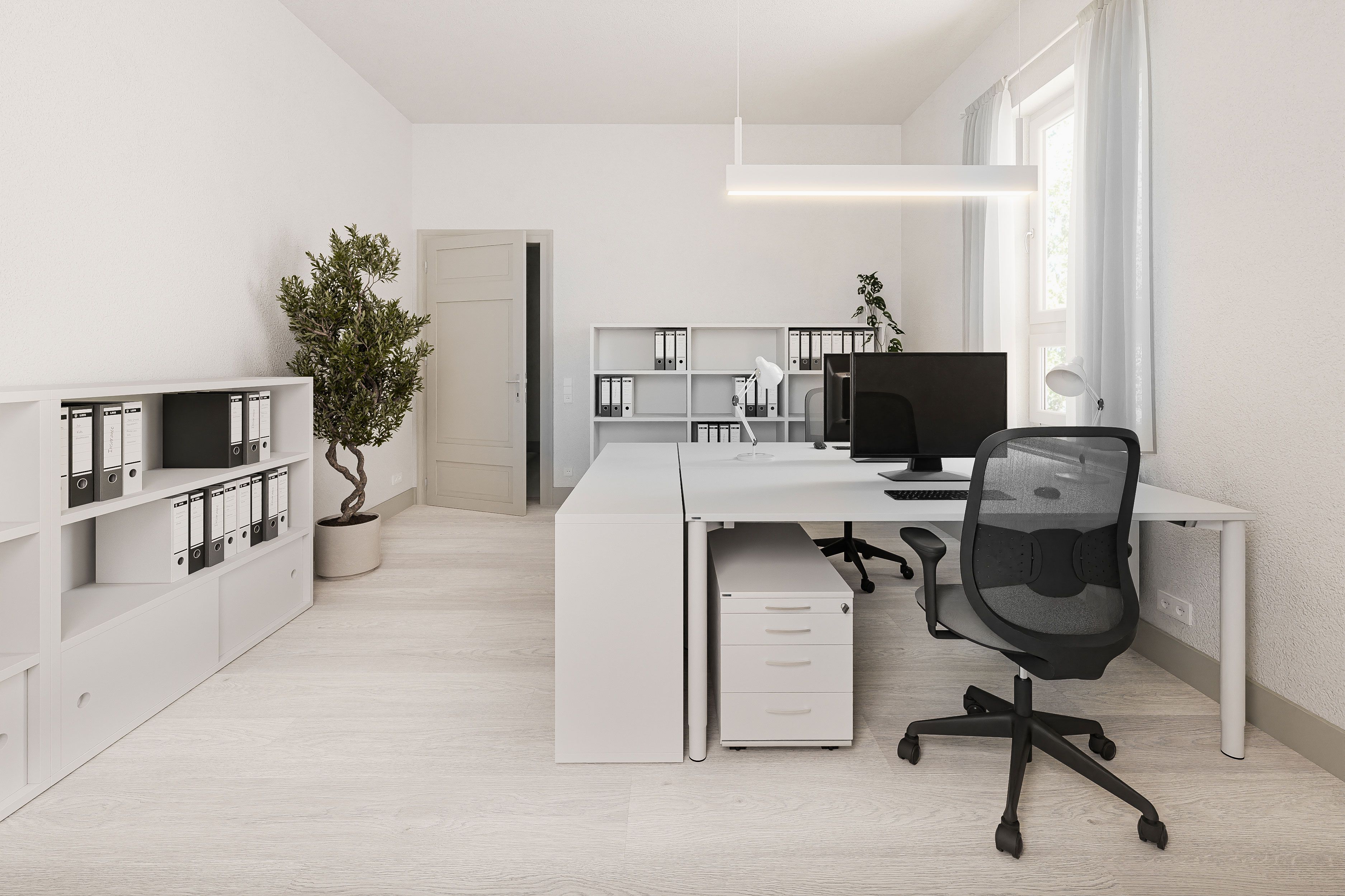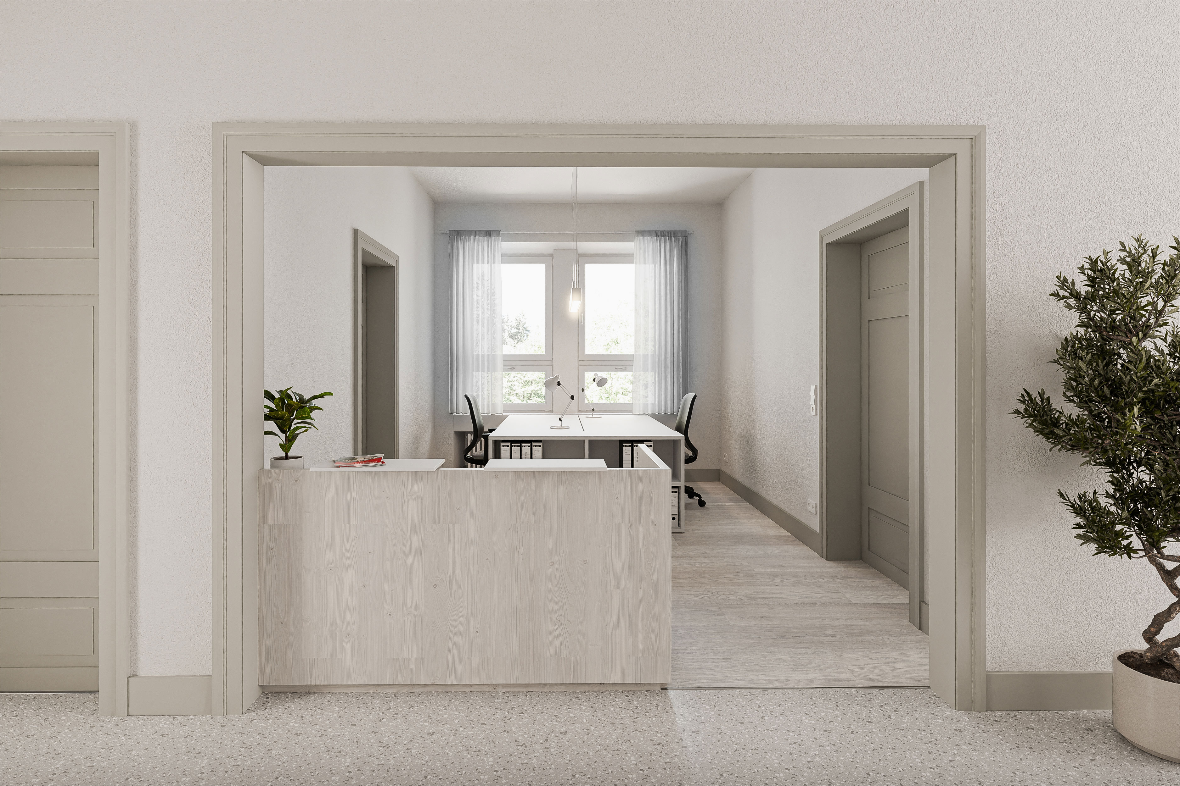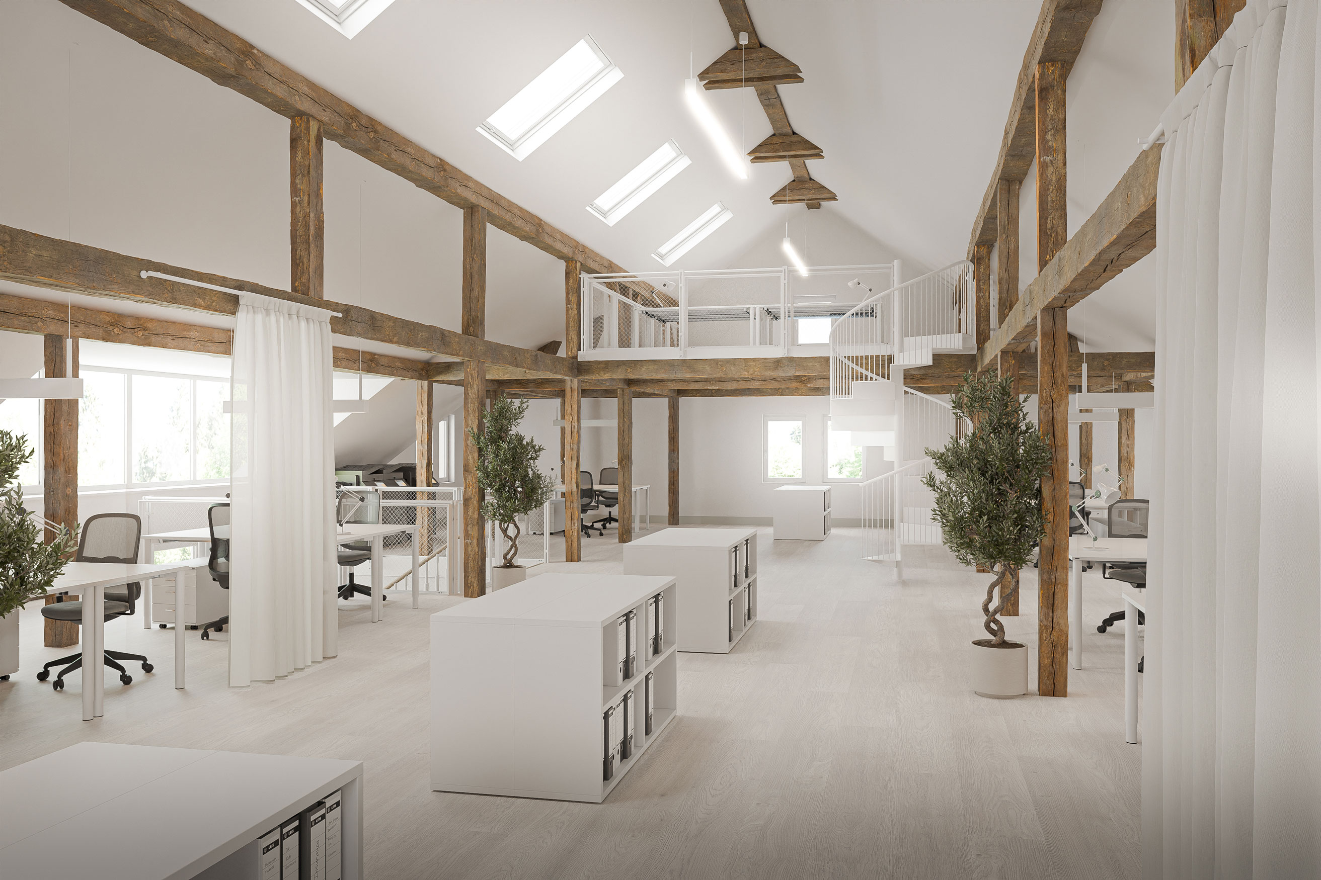 Das bestehende Firmengebäude der Firma Heinrich Hebel, eine in die Jahre gekommene Villa, wird im Bereich der Büroräume grundlegend saniert. Ziel ist es, die bestehenden Strukturen neu zu denken und zeitgemäße Arbeitsbereiche zu schaffen.In Zusammenarbeit mit Studio Dörflinger wurde einer der Entwurfsansätze visuell aufbereitet, um eine fundierte Entscheidungsgrundlage für die zukünftige Gestaltung zu schaffen. Ein besonderer Fokus lag auf dem neu geplanten, offenen Dachstuhl, der zusätzliche Arbeitsflächen bieten soll. Darüber hinaus wurden exemplarisch weitere Büroräume sowie der neue Empfang visualisiert. So entsteht ein klarer Eindruck des zukünftigen Raumkonzepts und der räumlichen Atmosphäre.