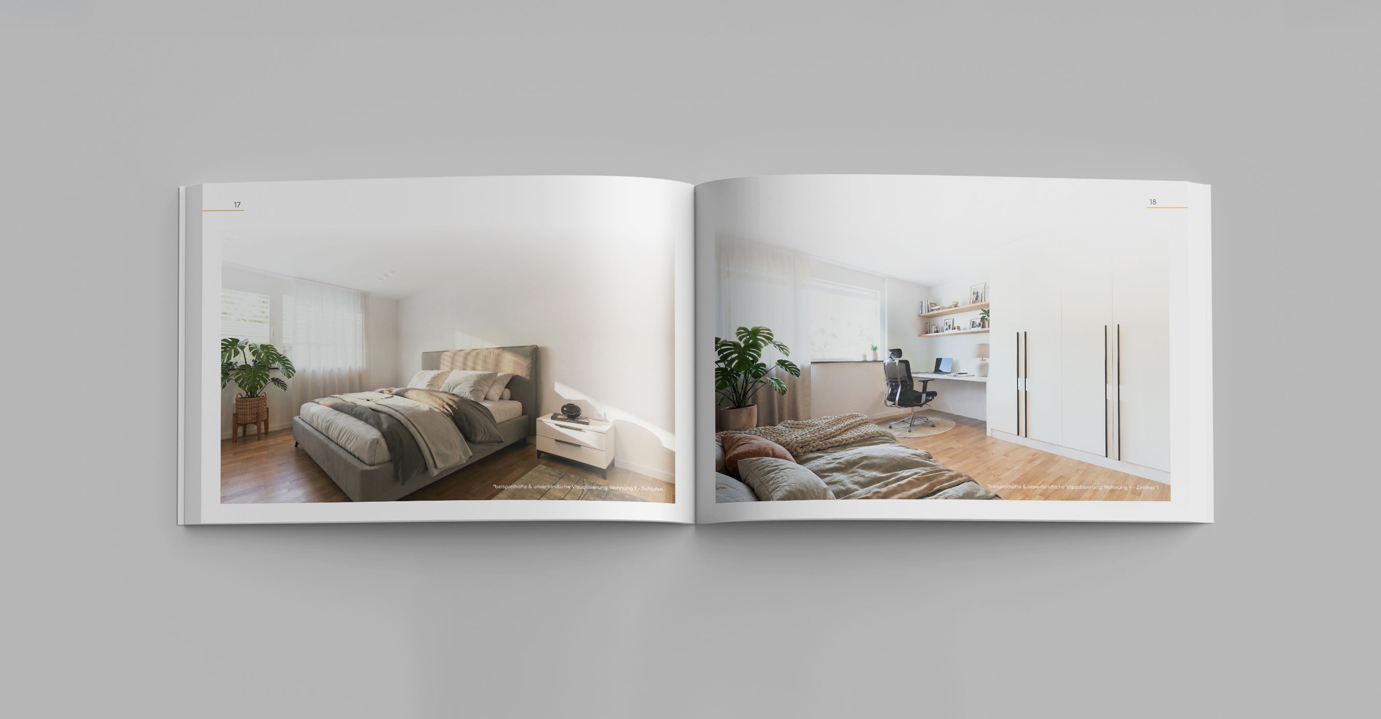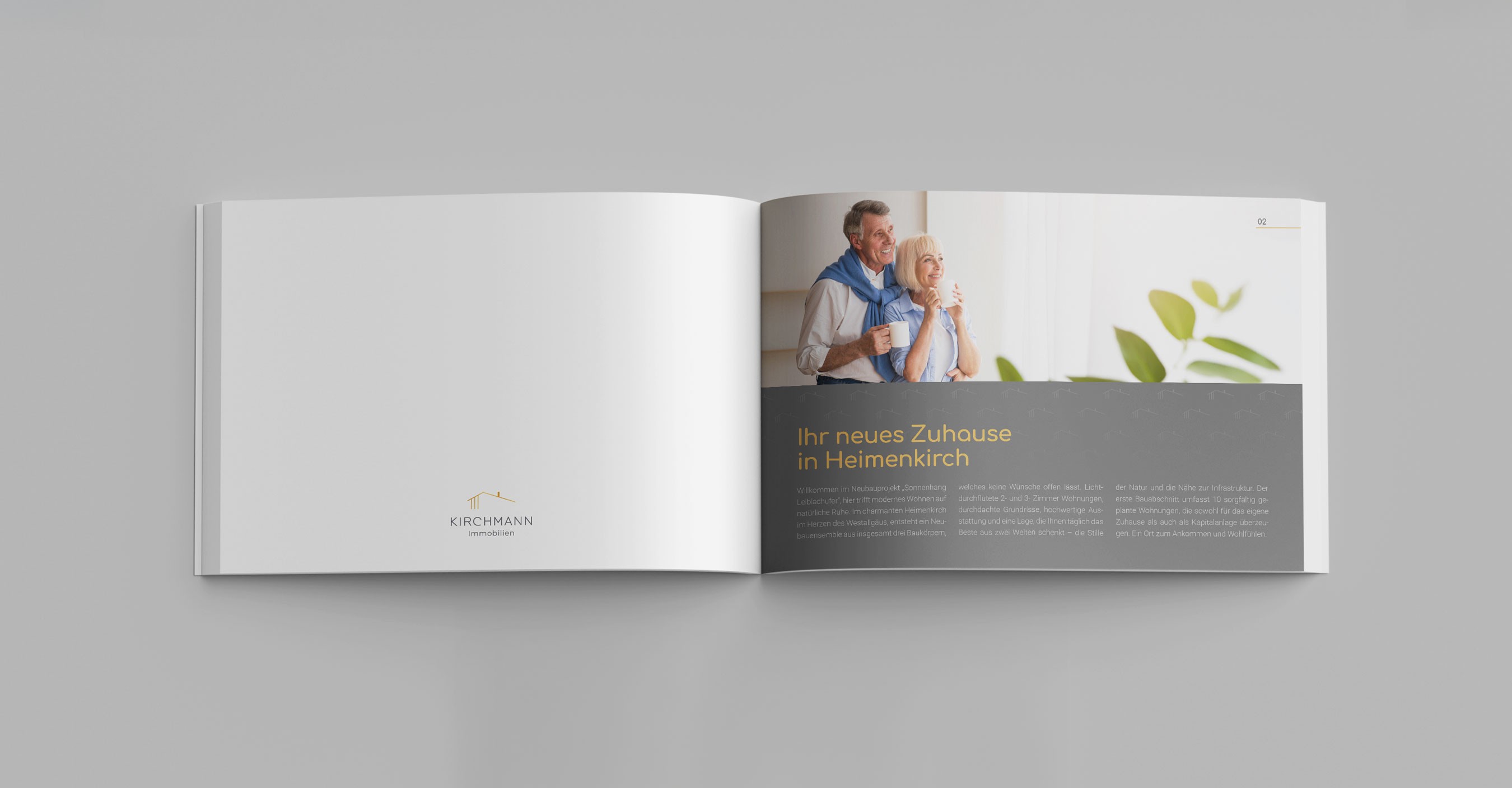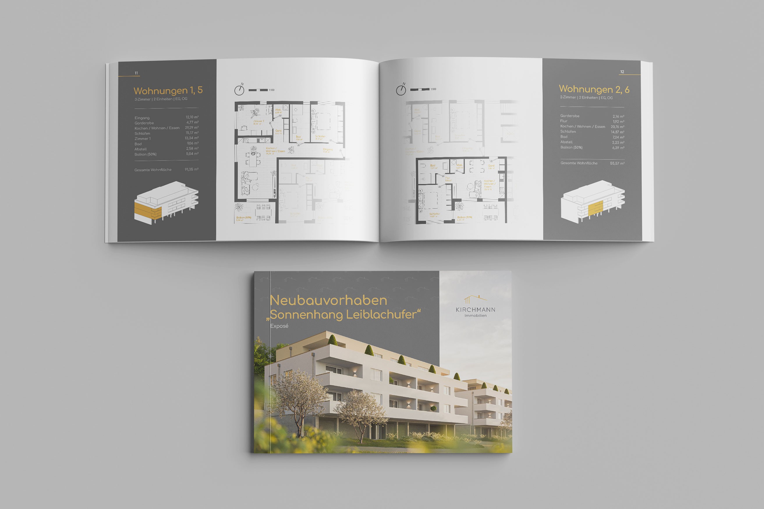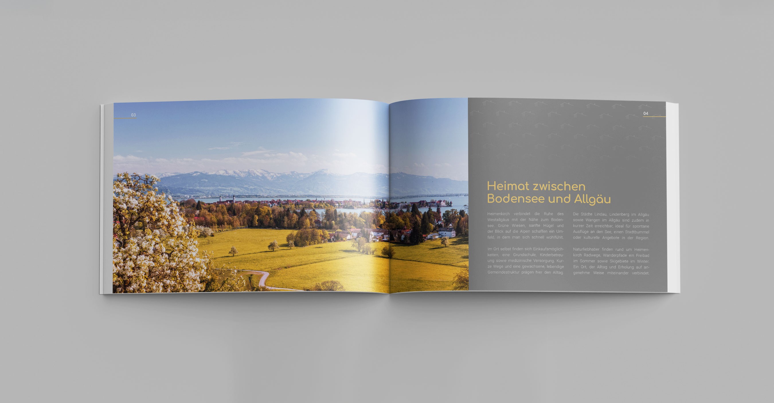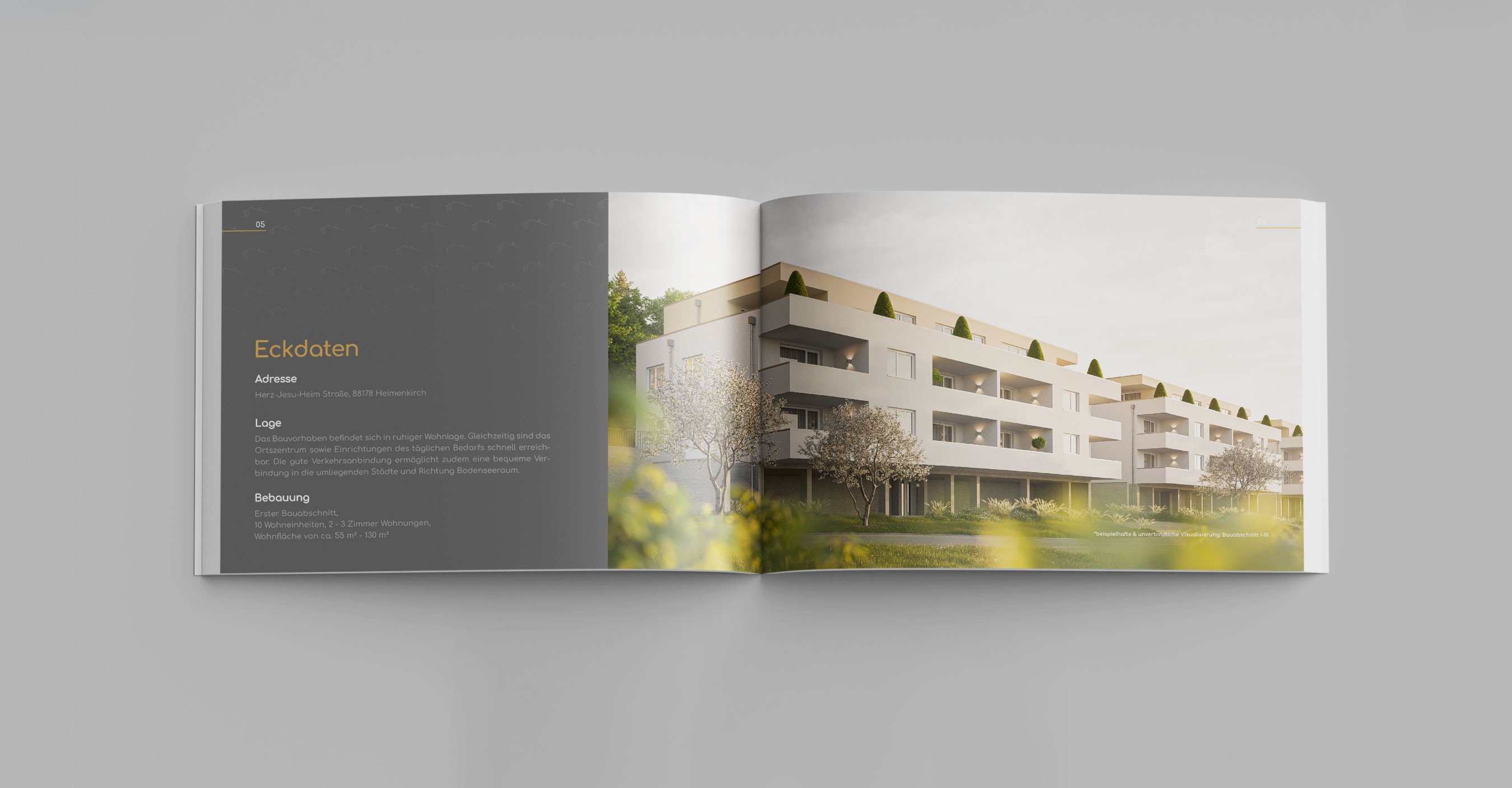In Heimenkirch entsteht mit dem Projekt „Sonnenhang Leiblachufer“ ein neues Wohnquartier, das in drei Bauabschnitten realisiert wird. Für die Vermarktung wurde zunächst der erste Bauabschnitt aufbereitet und gezielt für Interessenten zugänglich gemacht. Im Mittelpunkt stand die Entwicklung eines Exposés, das auf das Corporate Design von Kirchmann Immobilien abgestimmt ist und somit im bestehenden Erscheinungsbild in Anthrazit und Gold gestaltet wurde. Bestehende Innenvisualisierungen wurden integriert und durch neu aufbereitete Grundrisse sowie passende Texte und eine gezielte Bildauswahl ergänzt. So entsteht eine klare und stimmige Darstellung des Projekts, die den ersten Bauabschnitt kompakt vermittelt und Interessenten einen guten Überblick des Bauvorhabens ermöglicht.