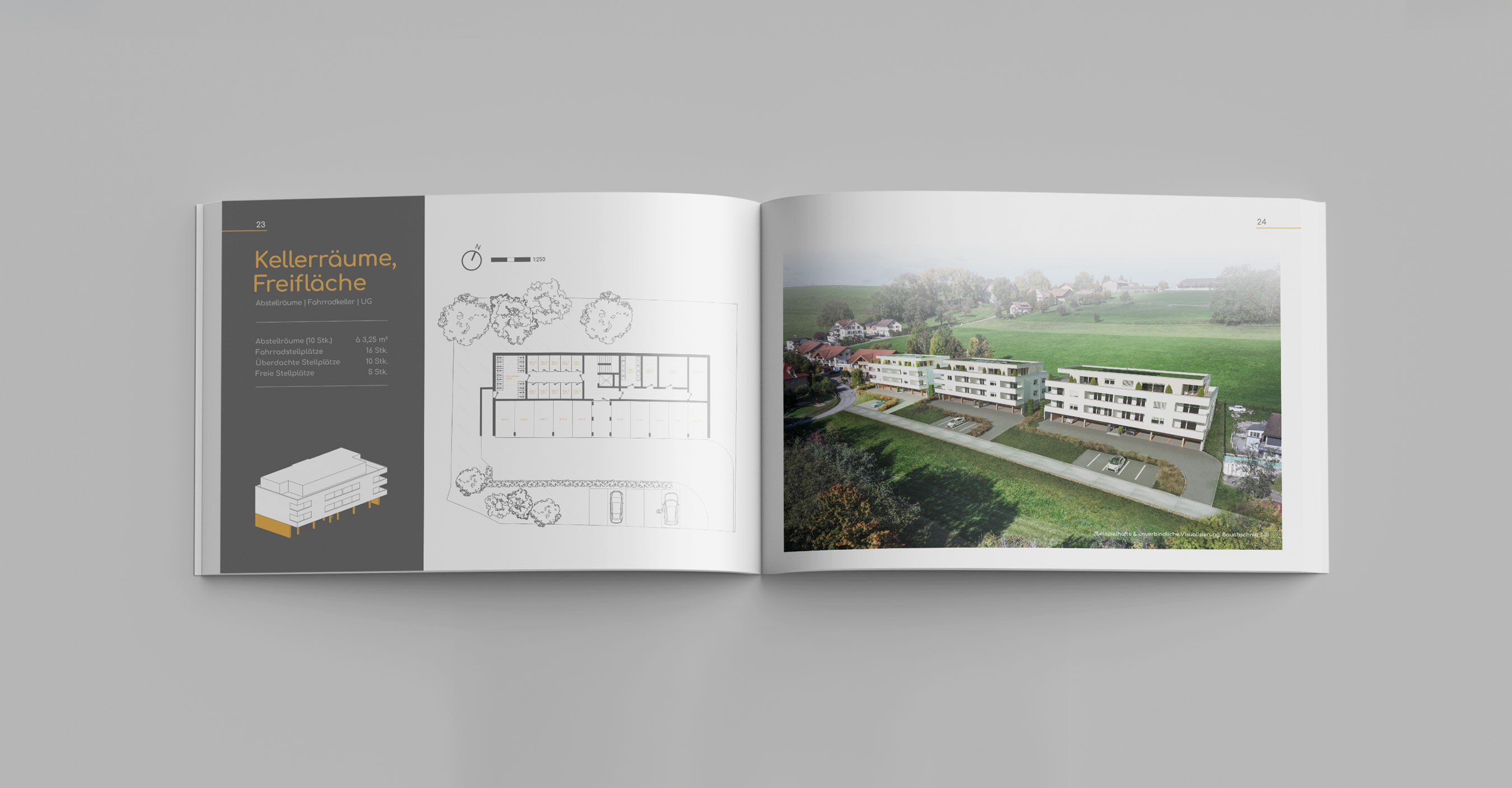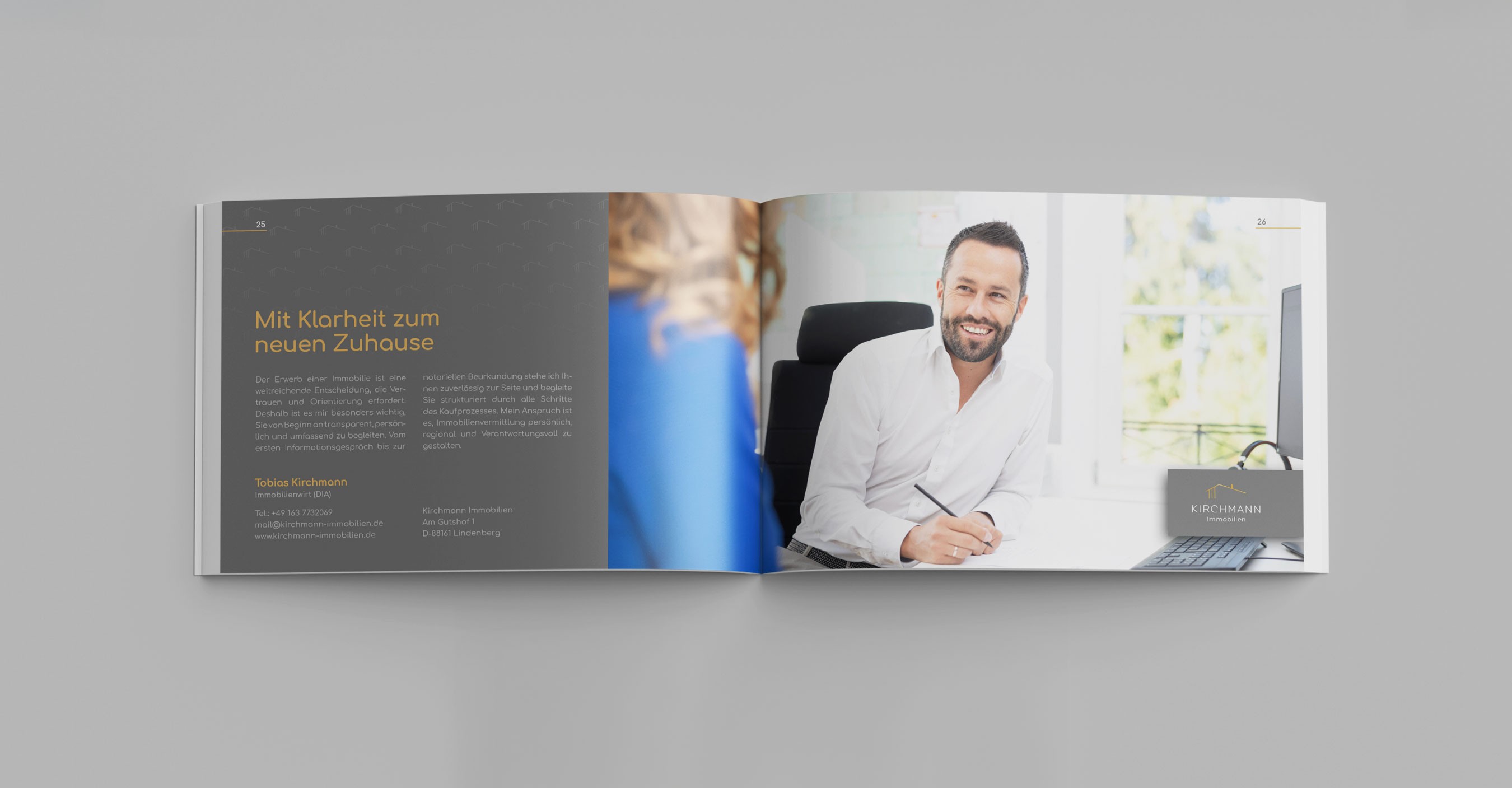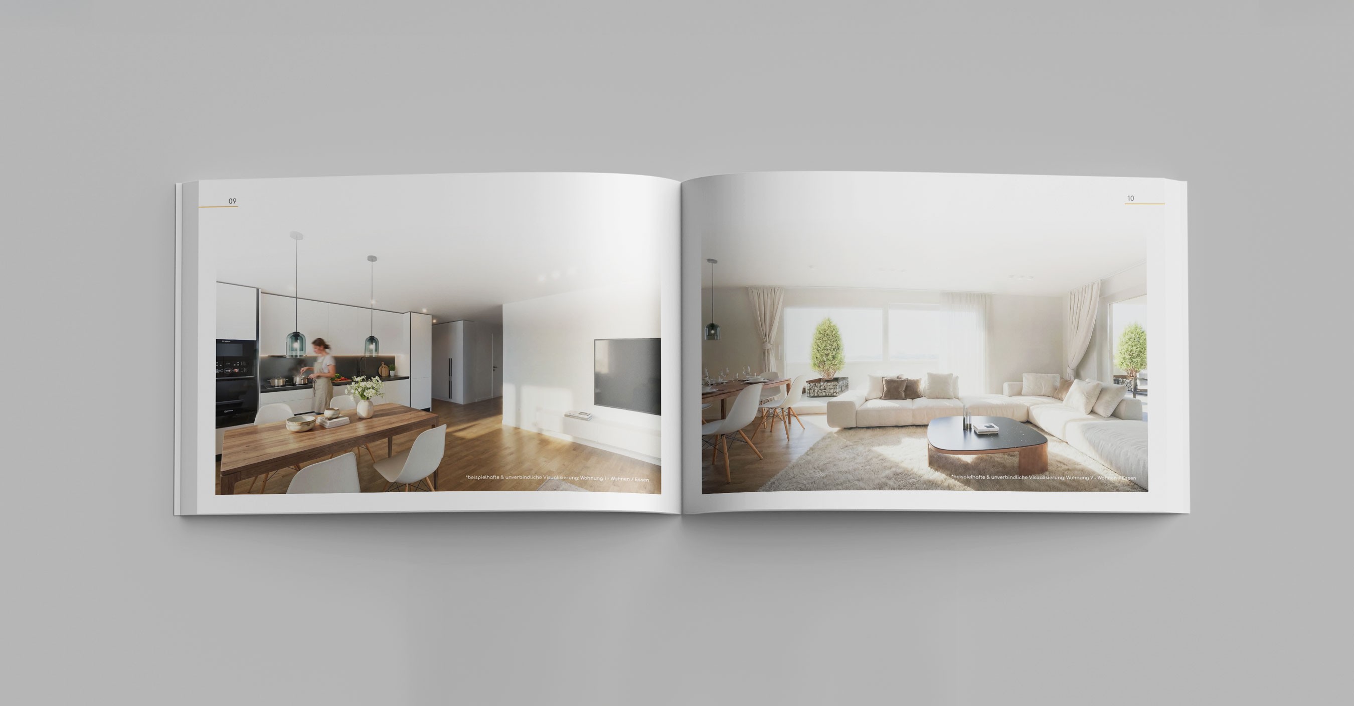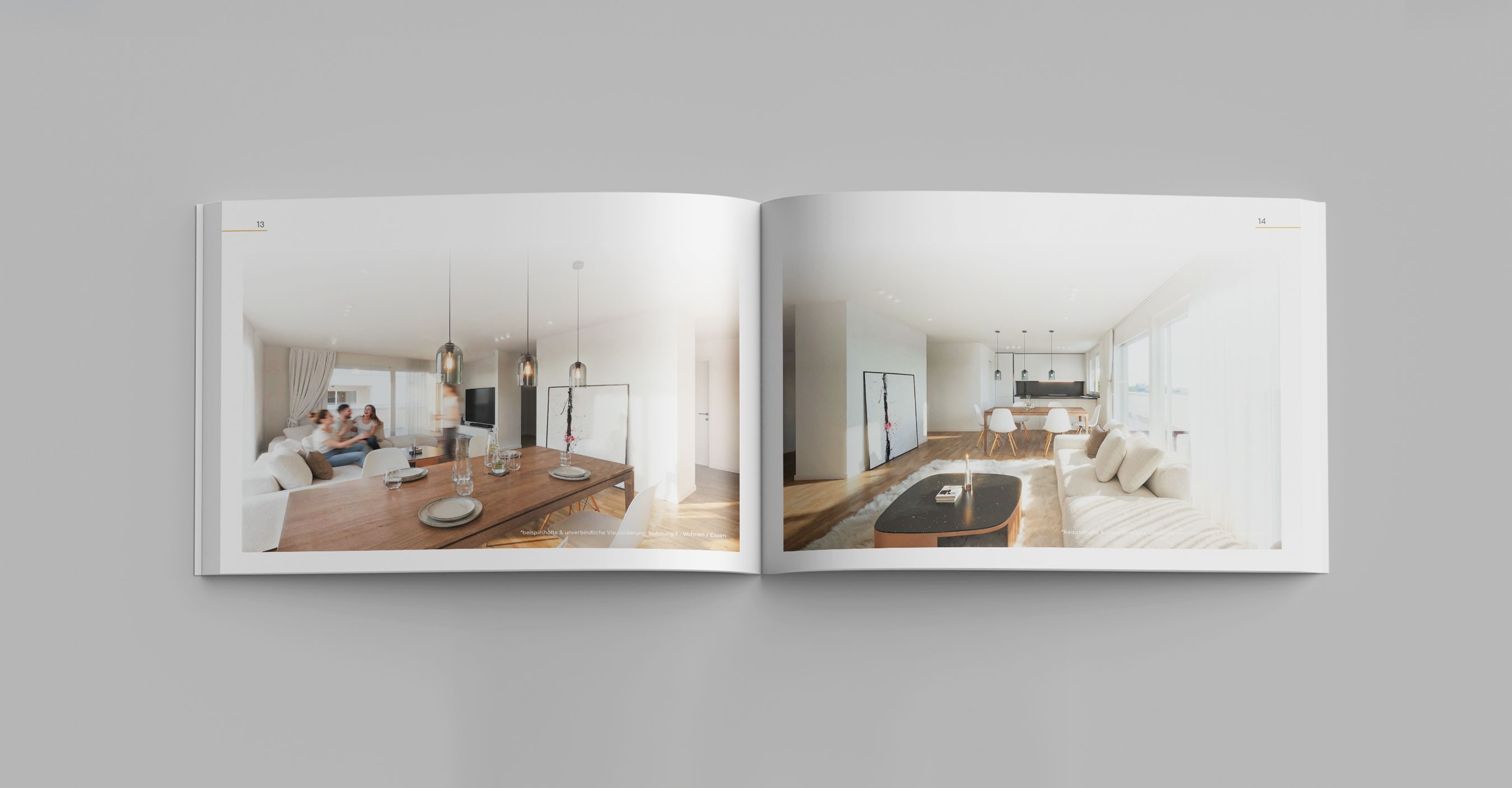 In Heimenkirch entsteht mit dem Projekt „Sonnenhang Leiblachufer“ ein neues Wohnquartier, das in drei Bauabschnitten realisiert wird. Für die Vermarktung wurde zunächst der erste Bauabschnitt aufbereitet und gezielt für Interessenten zugänglich gemacht. Im Mittelpunkt stand die Entwicklung eines Exposés, das auf das Corporate Design von Kirchmann Immobilien abgestimmt ist und somit im bestehenden Erscheinungsbild in Anthrazit und Gold gestaltet wurde. Bestehende Innenvisualisierungen wurden integriert und durch neu aufbereitete Grundrisse sowie passende Texte und eine gezielte Bildauswahl ergänzt. So entsteht eine klare und stimmige Darstellung des Projekts, die den ersten Bauabschnitt kompakt vermittelt und Interessenten einen guten Überblick des Bauvorhabens ermöglicht.